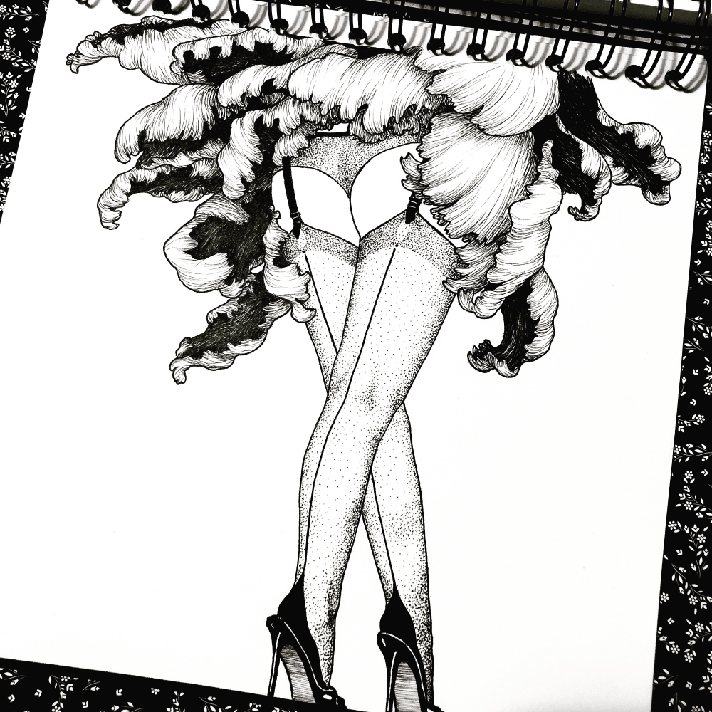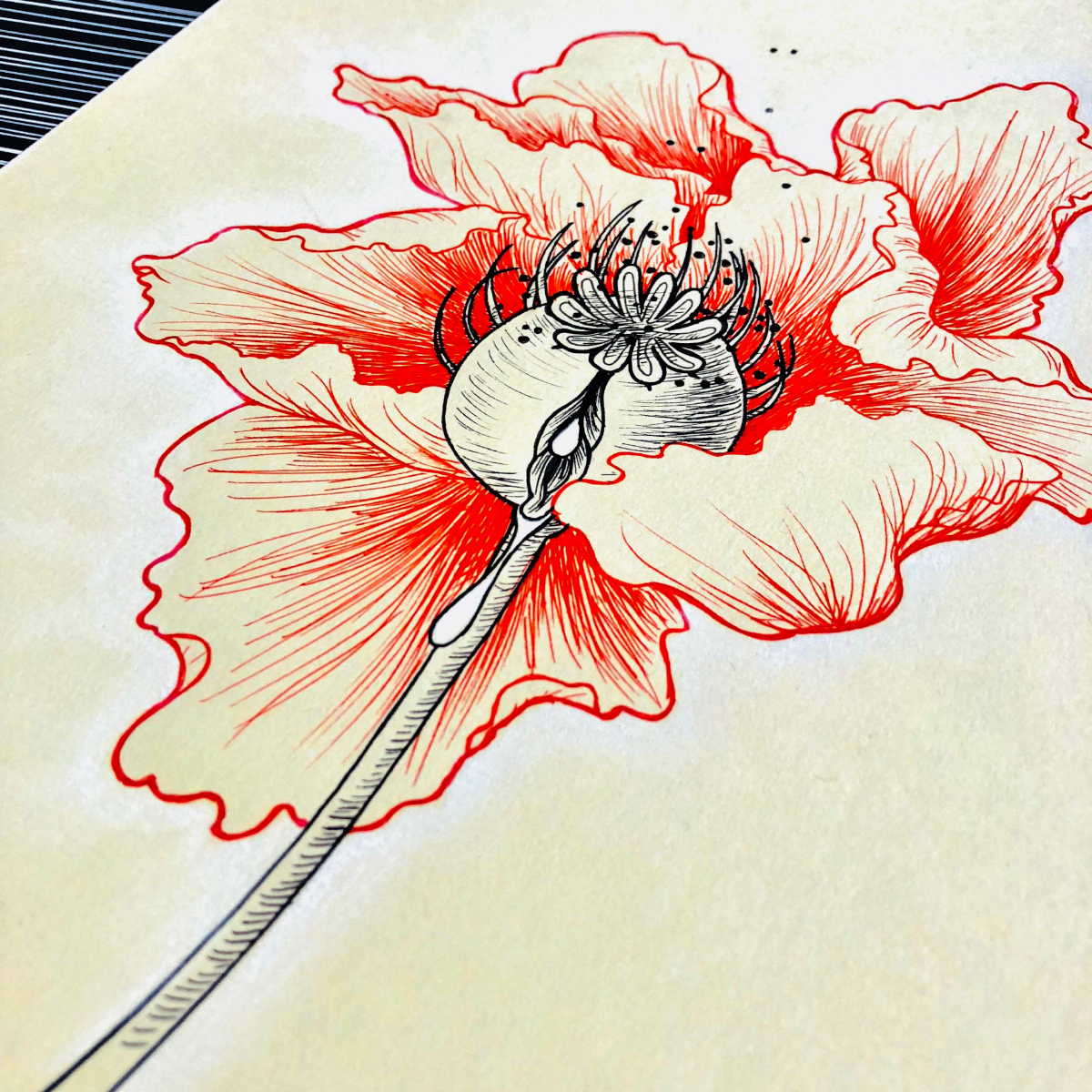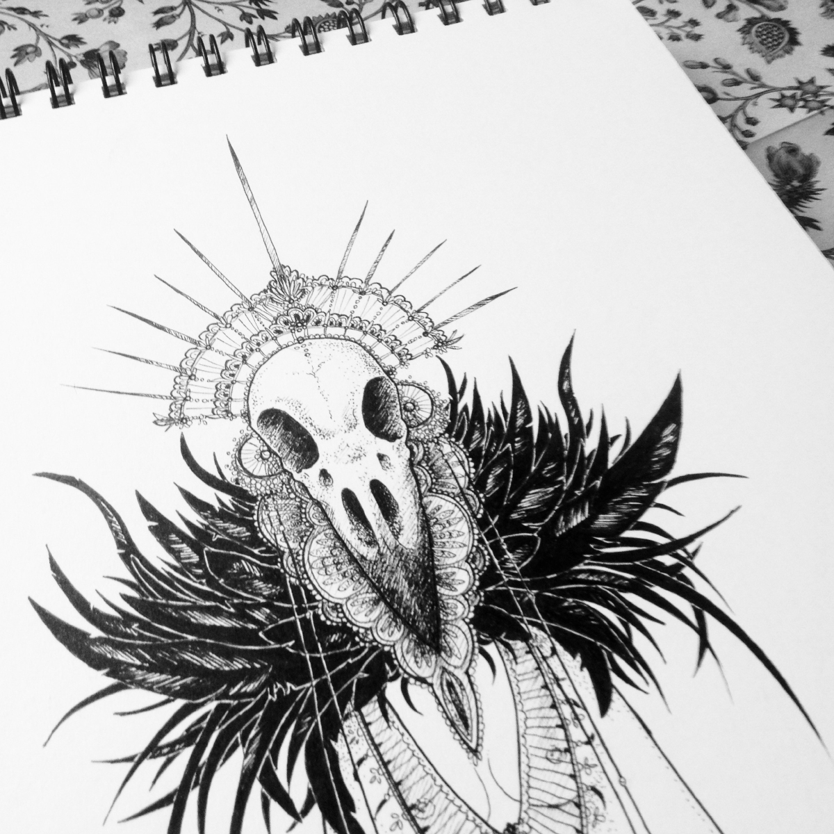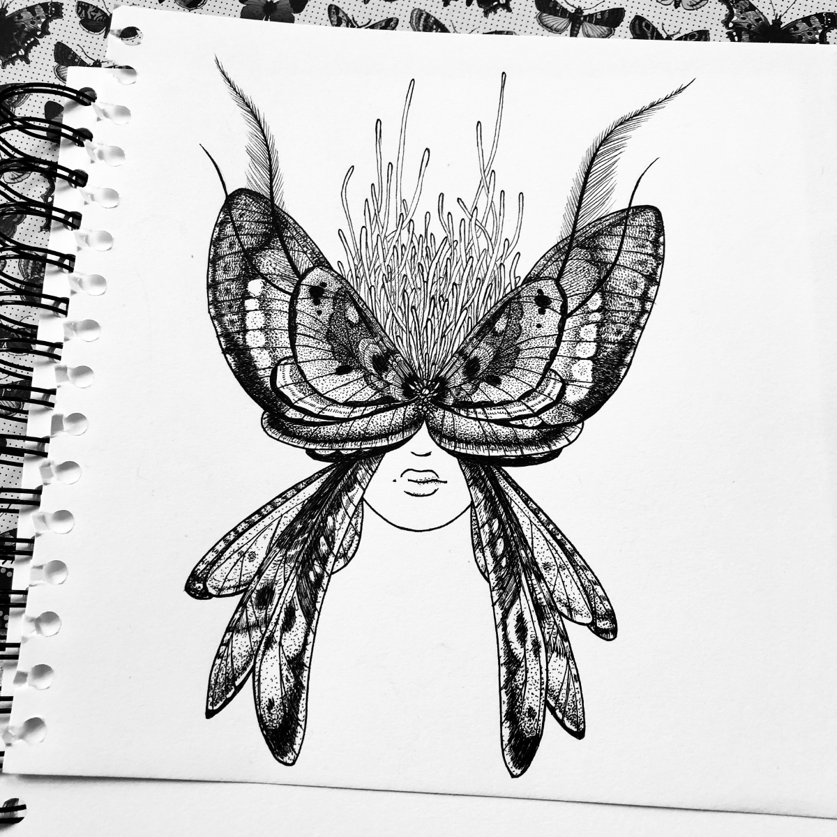Themen habe ich eigentliche viele: von ganz einfachen blumigen und verspielten Motiven, bis zu düsteren und teilweise auch erotischen und zweideutigen Motiven. Oft sind es auch surreale Fabelwesen in Mensch- oder Tiergestalt. Mich interessiert auch das Vergängliche und Morbide, was ich dann mit „lebendigen“ Elementen kombiniere und aufs Papier bringe.”